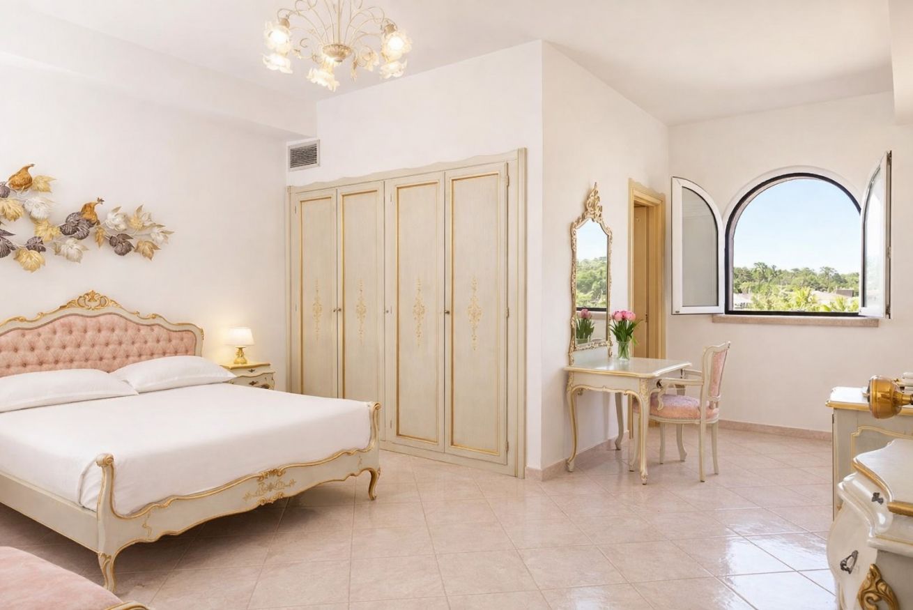 Elegante camera tripla con letto matrimoniale e un singolo, dotata di aria condizionata e bagno privato.