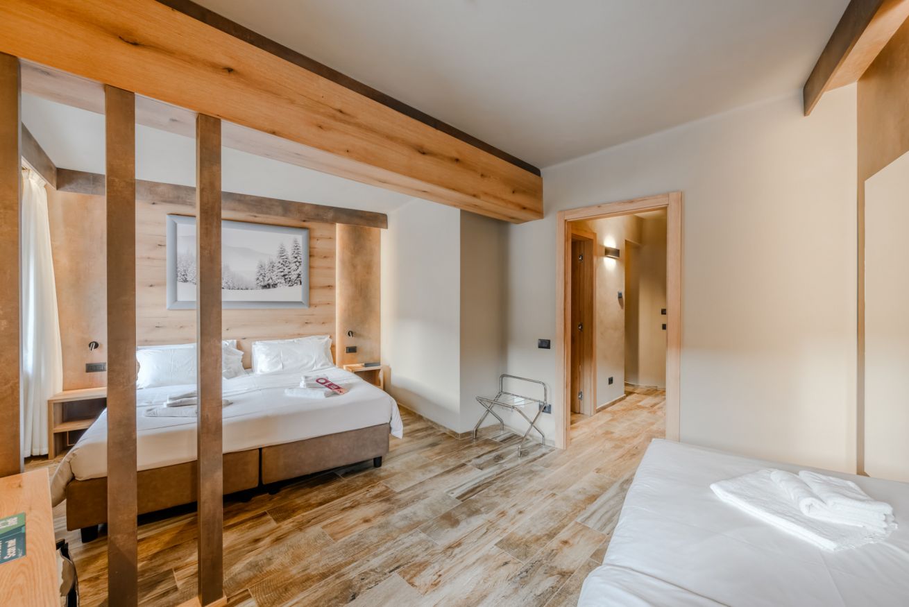 Ampia camera tripla con un letto matrimoniale e un letto singolo, e vista sulle montagne