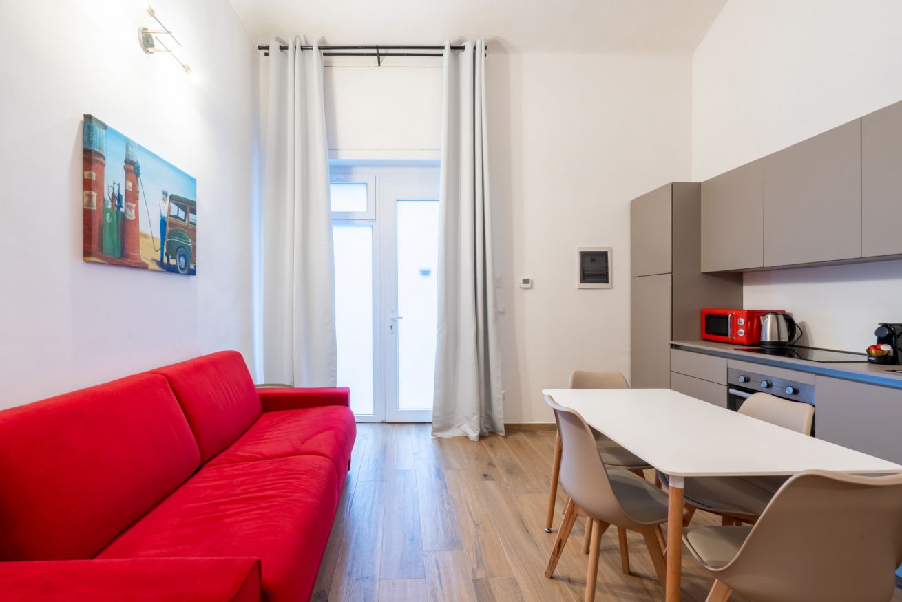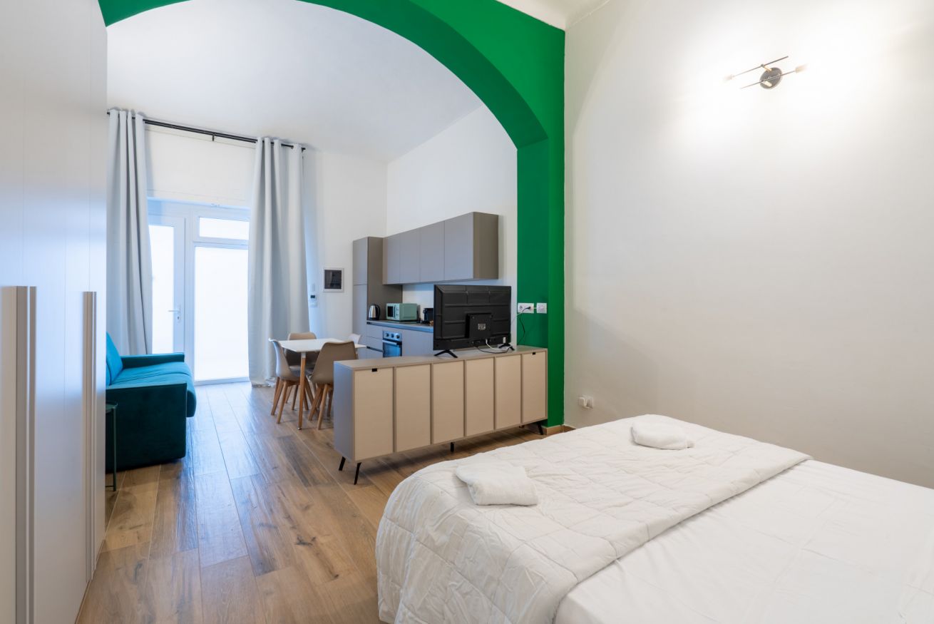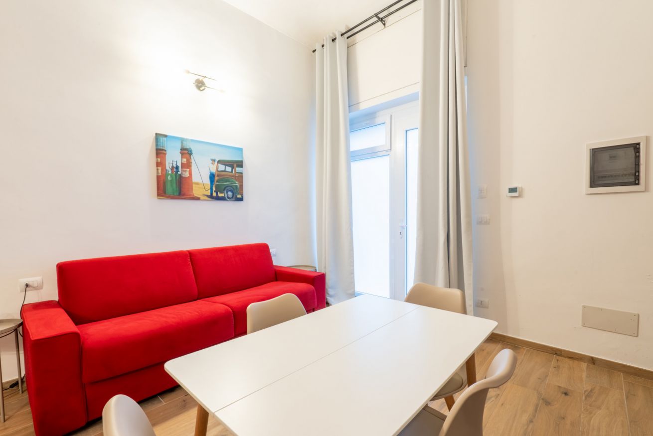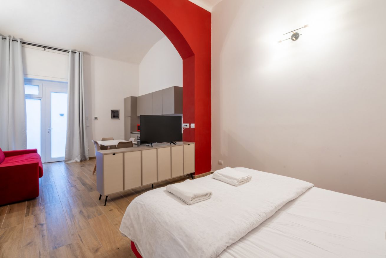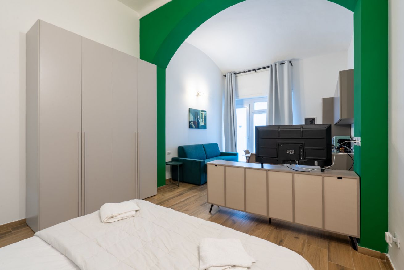 Monolocale con letto matrimoniale, divano letto matrimoniale e angolo cottura attrezzato. L'appartamento si trova in edificio separato rispetto al corpo centrale, in Via Clemente Stefano 8C bis.