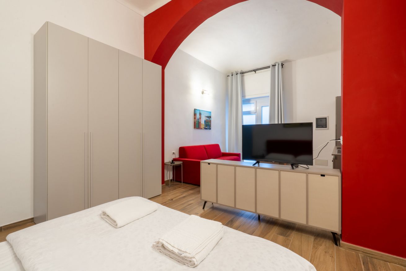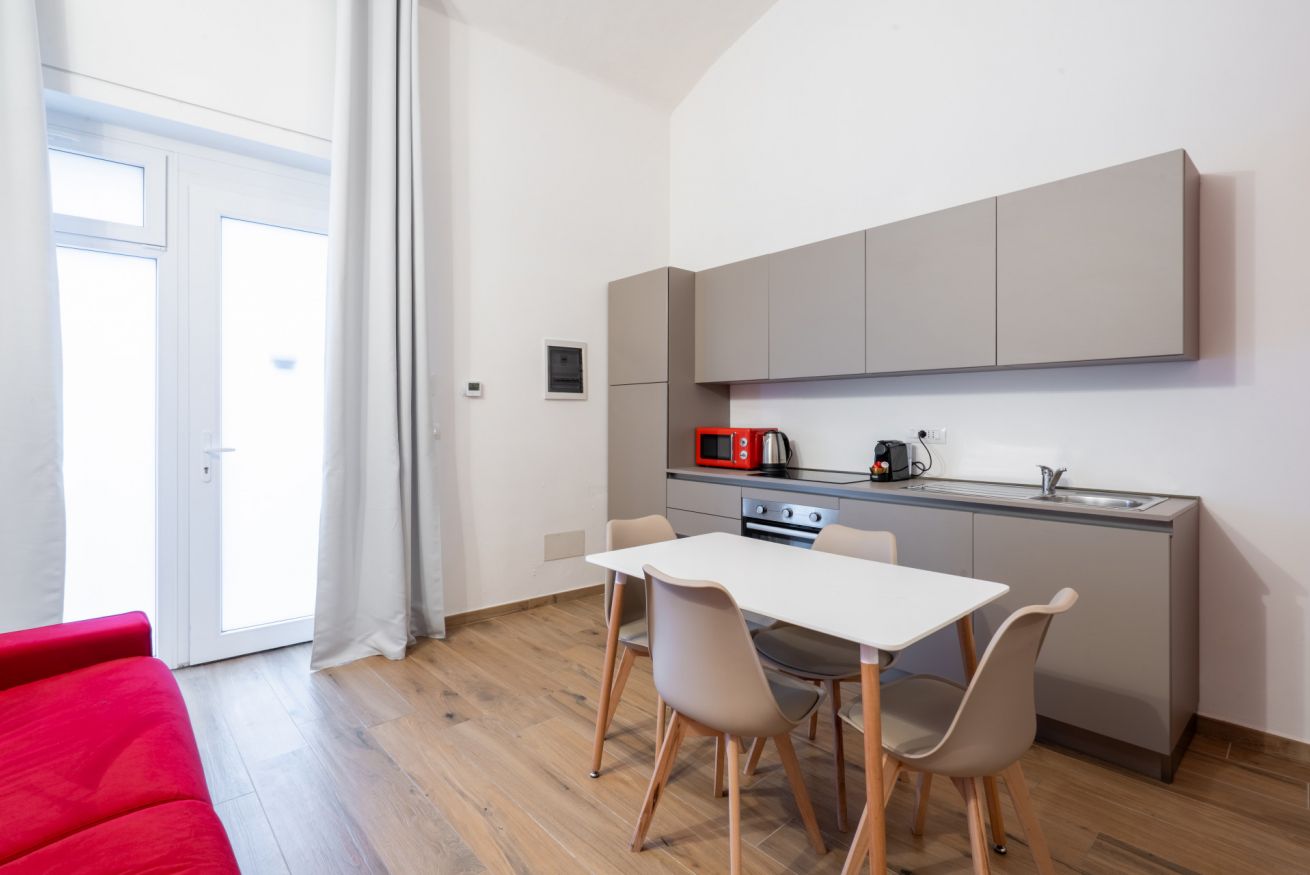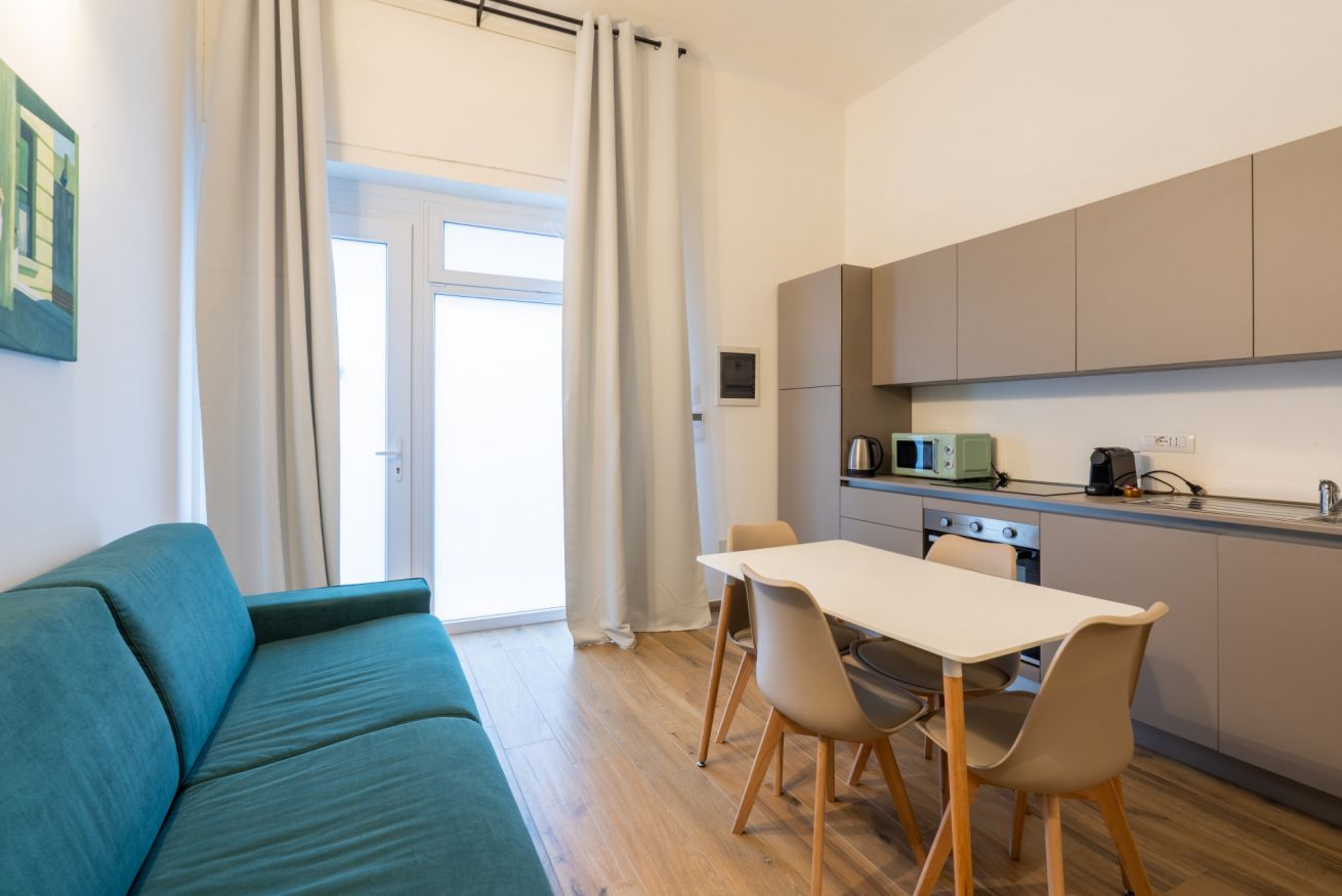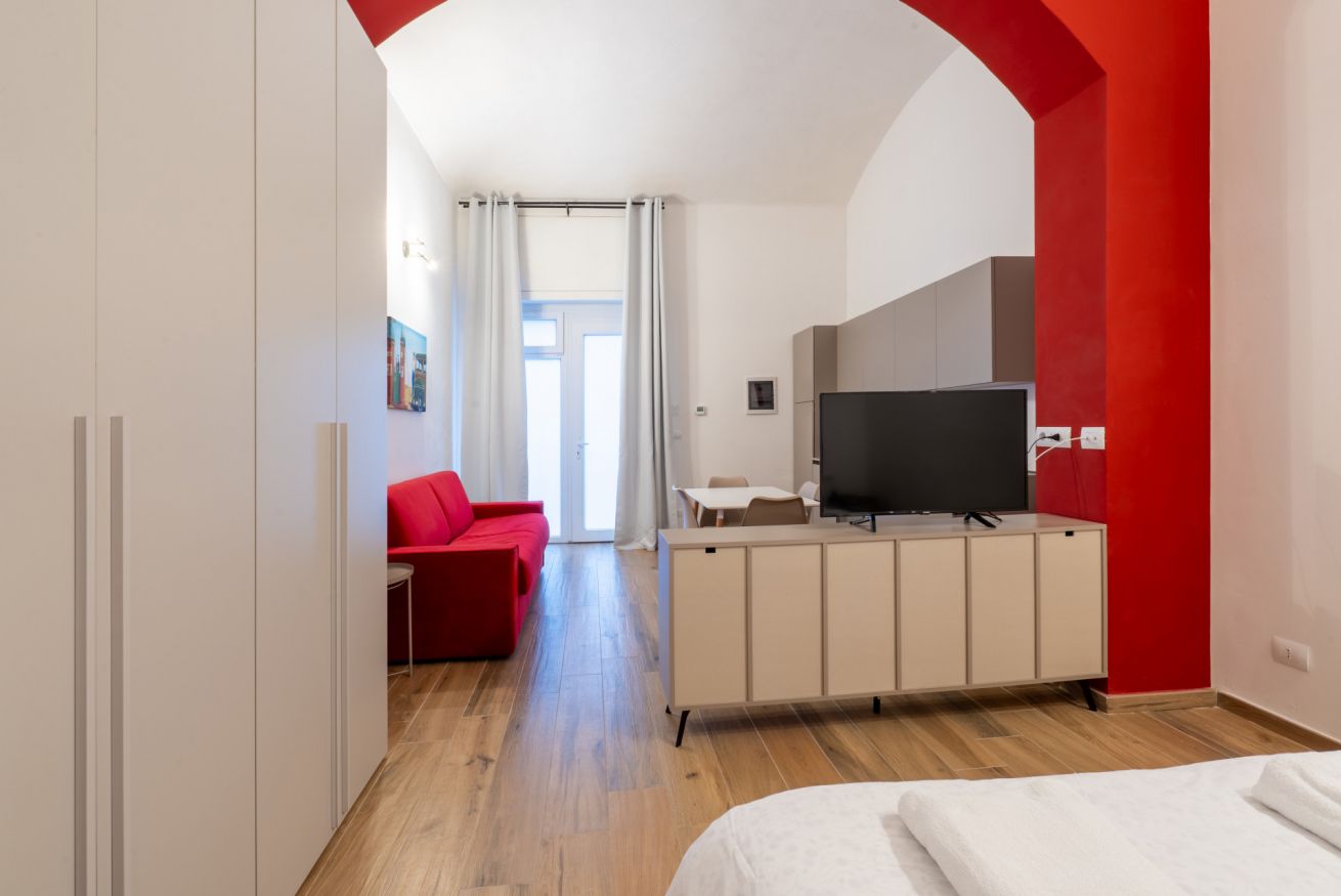 Monolocale con letto matrimoniale, divano letto matrimoniale e angolo cottura attrezzato. L'appartamento si trova in edificio separato rispetto al corpo centrale, in Via Clemente Stefano 8C bis.