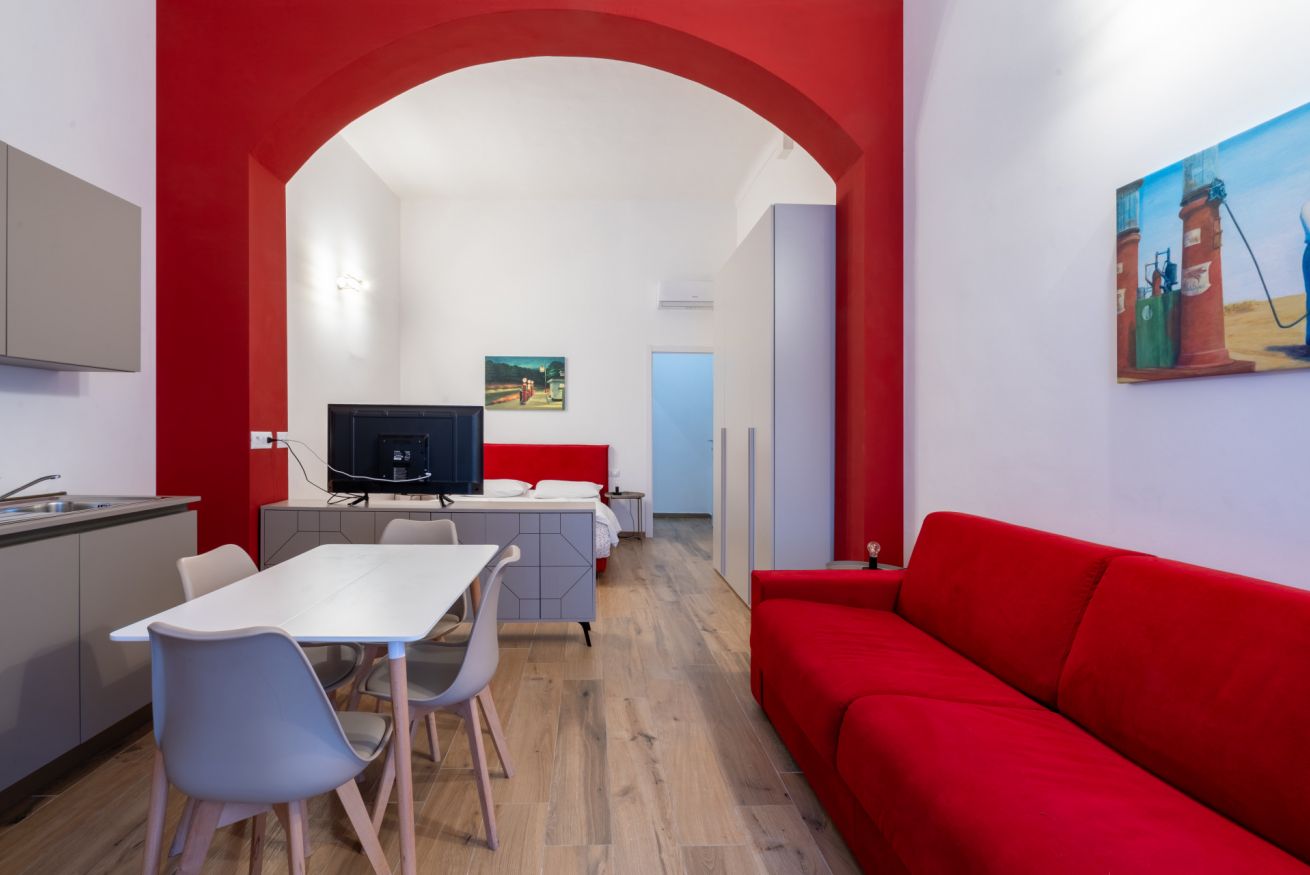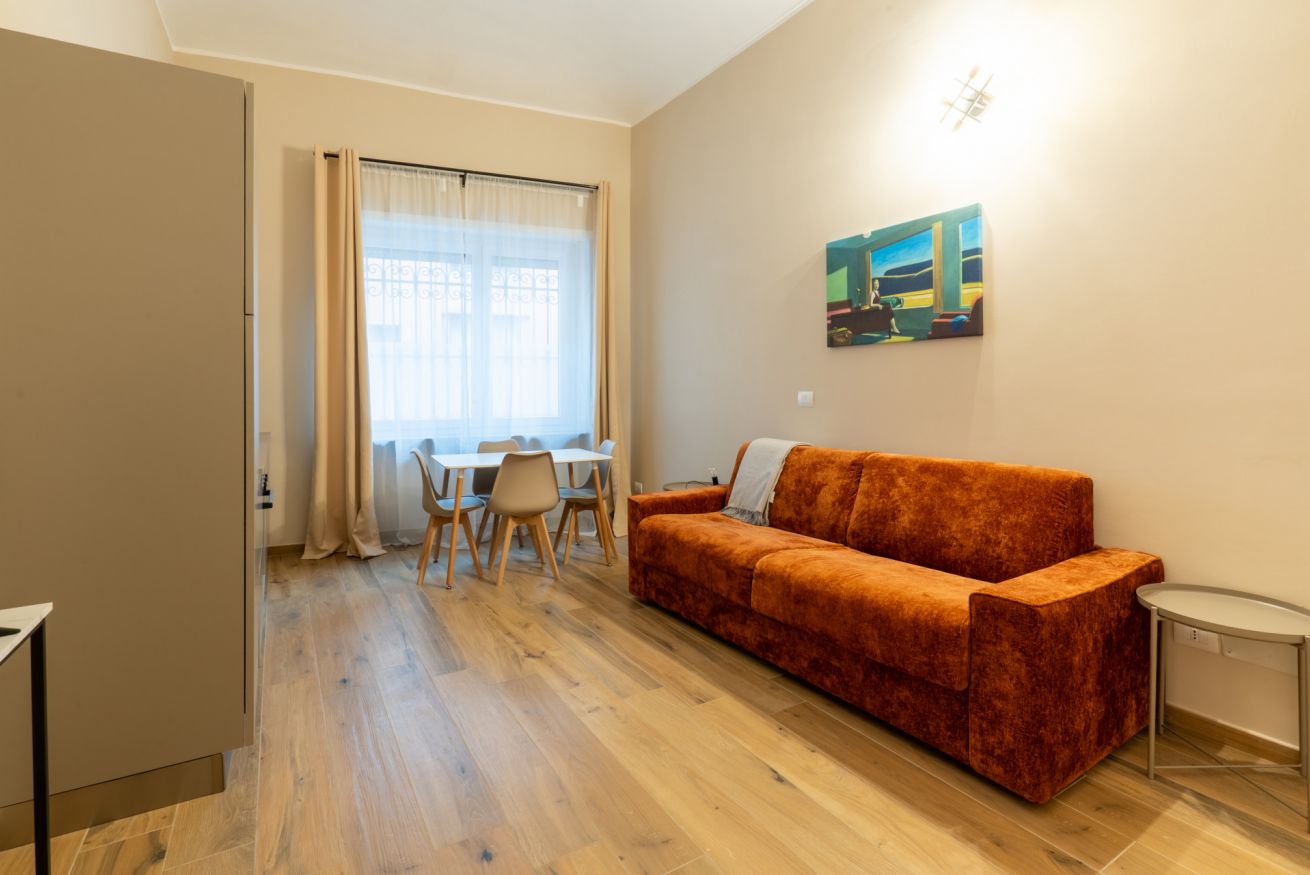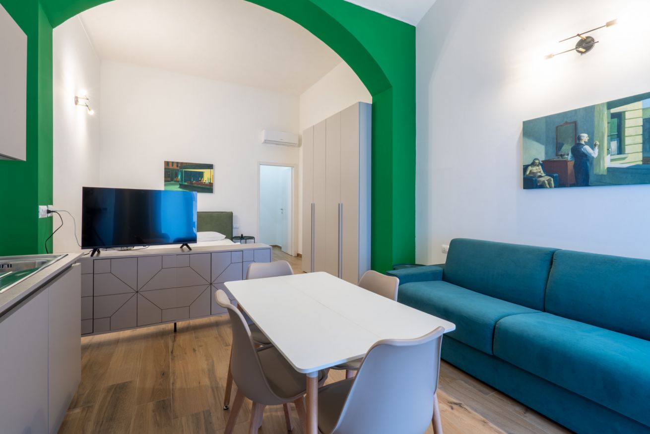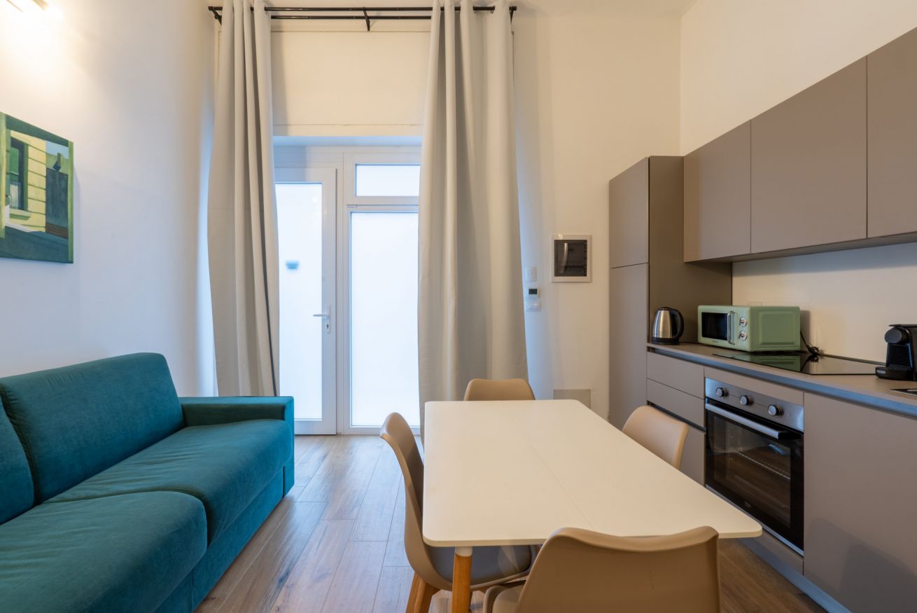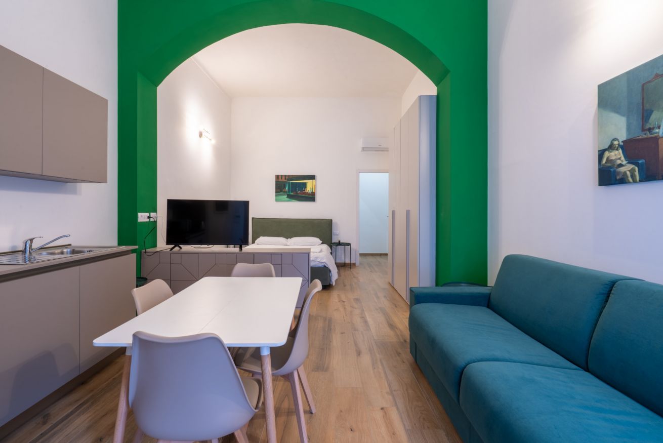 Monolocale con letto matrimoniale, divano letto matrimoniale e angolo cottura attrezzato. L'appartamento si trova in edificio separato rispetto al corpo centrale, in Via Clemente Stefano 8C bis.
