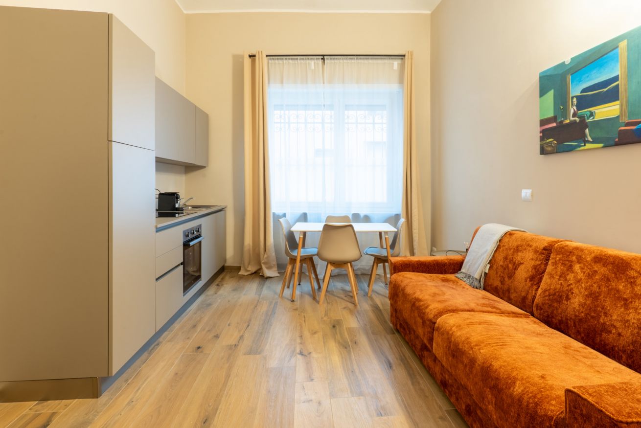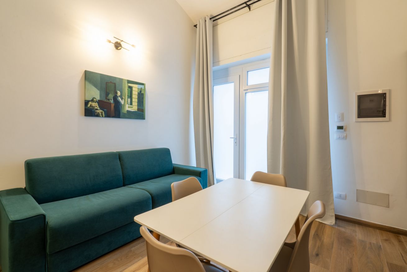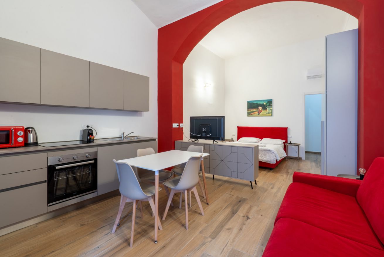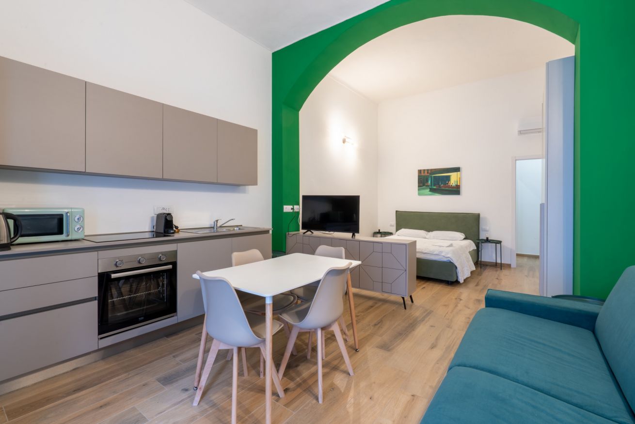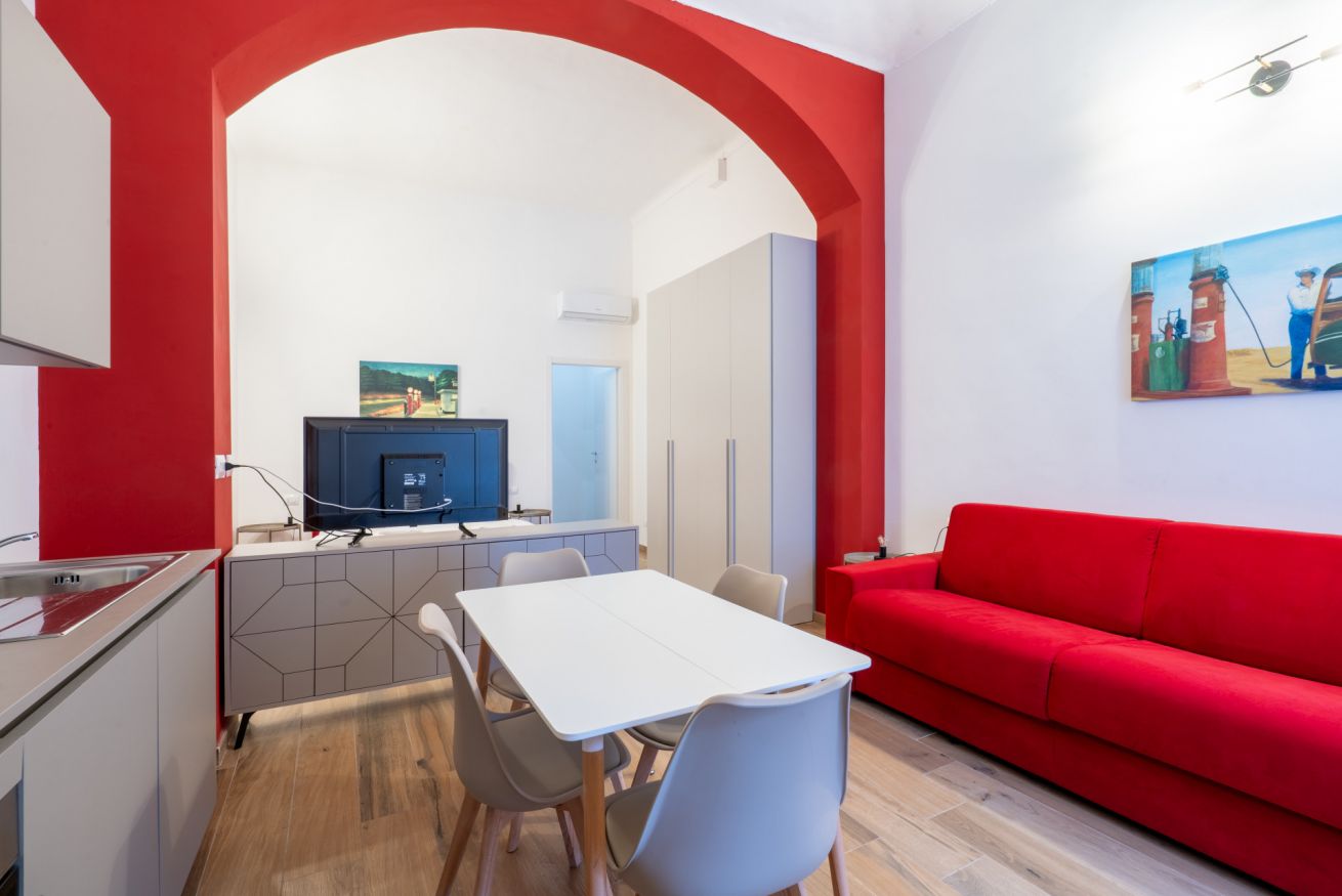 Monolocale con letto matrimoniale, divano letto matrimoniale e angolo cottura attrezzato. L'appartamento si trova in edificio separato rispetto al corpo centrale, in Via Clemente Stefano 8C bis.